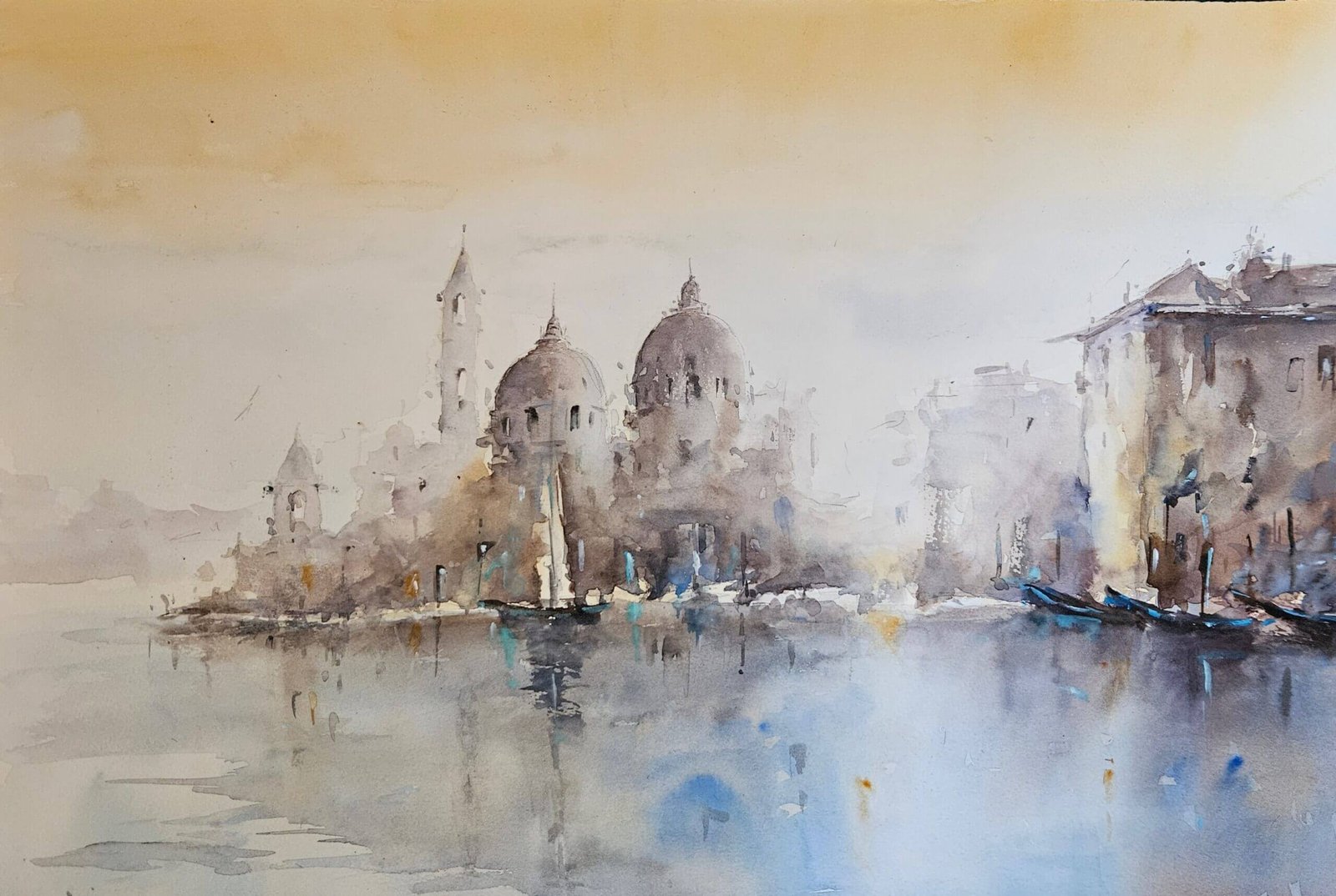 Come in tutta la ricerca dell’artista, l’acquerello è utilizzato come strumento poetico: un linguaggio capace di suggerire più che affermare, di evocare più che descrivere. Impressioni di Venezia non rappresenta un luogo preciso, ma una percezione interiore, un momento di quiete in cui la città sembra trattenere il respiro.