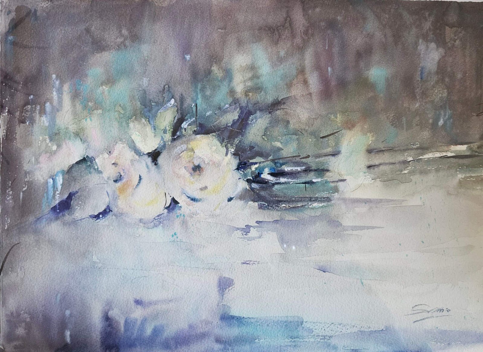 Il colore si muove per velature sovrapposte, in una gamma tenue di grigi, azzurri e verdi polverosi, attraversata da accenni luminosi che suggeriscono la presenza dei fiori più che affermarla. Il segno è minimo, talvolta interrotto, lasciato libero di dialogare con il bianco della carta, che diventa spazio di silenzio e pausa visiva.