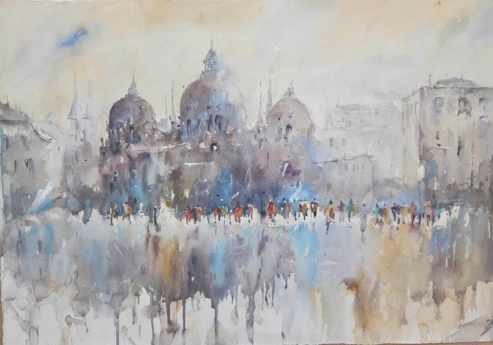 In questo dipinto, il confine tra architettura e atmosfera si annulla: l’artista non dipinge Venezia, ma la sensazione di Venezia — la sua malinconia luminosa, la sua grazia instabile. San Marco Dream non è un luogo, ma uno stato d’animo. È l’eco di una città che continua a respirare nelle sfumature, nelle velature, nelle trasparenze che solo l’acquerello, nelle mani di chi ne conosce la poesia, può restituire.